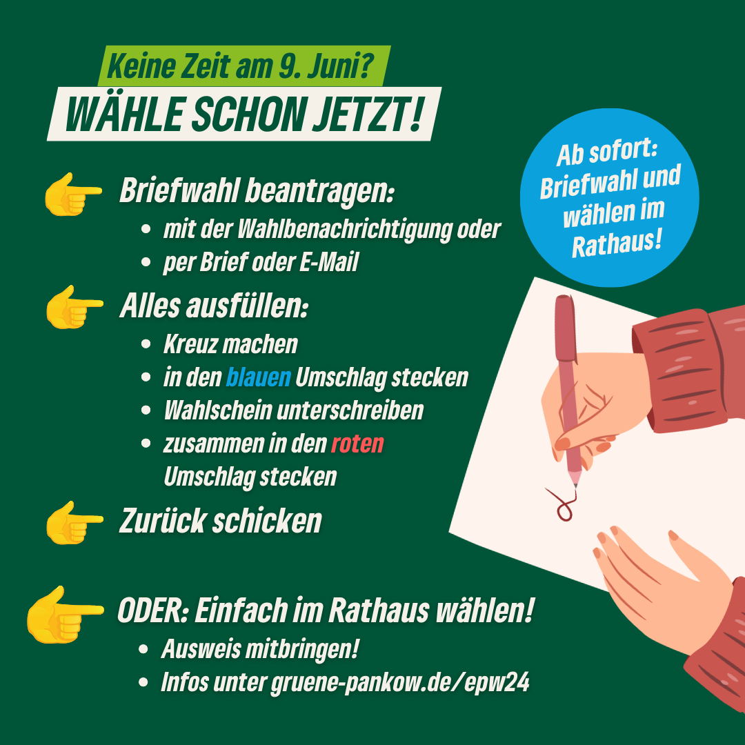 Seit heute Morgen hat die Briefwahlstelle im Rathaus Pankow geöffnet. Dort könnt Ihr schon jetzt Eure Stimme zur EU-Wahl abgeben für ein ökologisches und soziales, progressives und demokratisches Europa. Es ist ganz leicht: Einfach Euren Ausweis mitbringen!