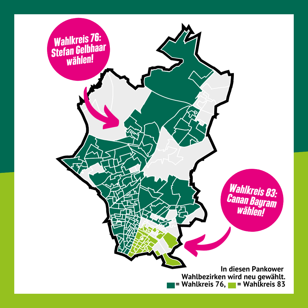 Der Osten des Prenzlauer Bergs von der Prenzlauer Allee an gehört zum Bundestagswahlkreis 83, gemeinsam mit Friedrichshain und Kreuzberg. Auch hier sind viele Wahllokale neu zu wählen. Canan Bayram will ihr Direktmandat verteidigen, um sich gestärkt im Bundestag weiter für ihre Themen einzusetzen: Mieten, Strafrecht, Bürger*innenrechte, Antidiskriminierung und Friedenspolitik.