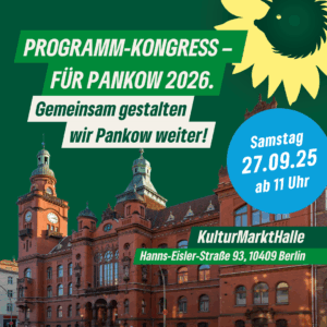 Bis Februar steht die Arbeit an unseren bündnisgrünen Wahlprogrammen im Mittelpunkt. Wir stellen auf mehreren Mitgliedertreffen die Entwürfe für Berlin und Pankow vor. Am 14./15. Februar 2026 entscheidet die Landesdelegiertenkonferenz über das Berliner Programm, am 24. Februar 2026 beschließen wir unser Pankower Programm.